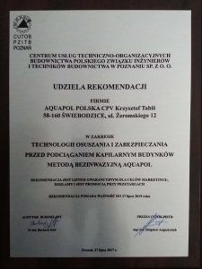 - Osuszenia murów z wilgoci kapilarnej do stanu wilgotności naturalnej
